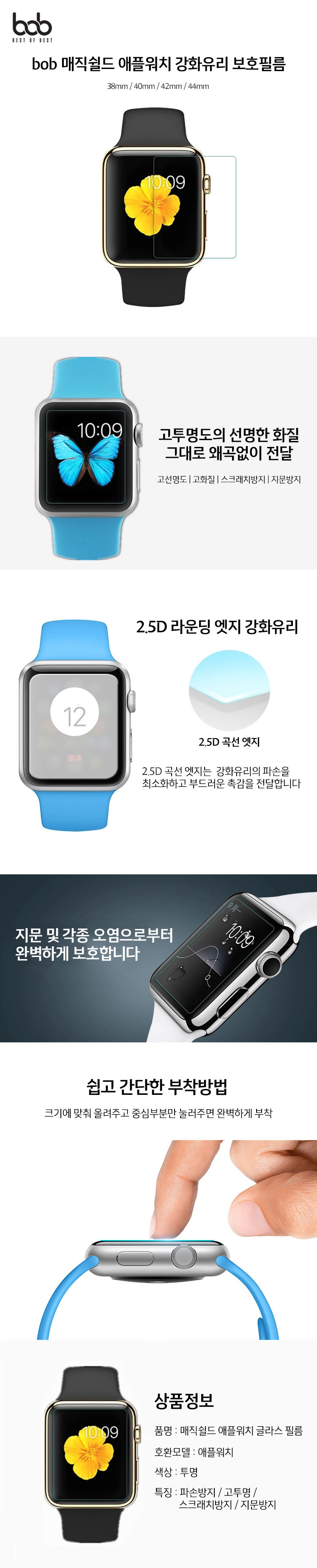 bob 매직쉴드 애플워치 전세대 강화유리 보호필름 38/42/40/44MM